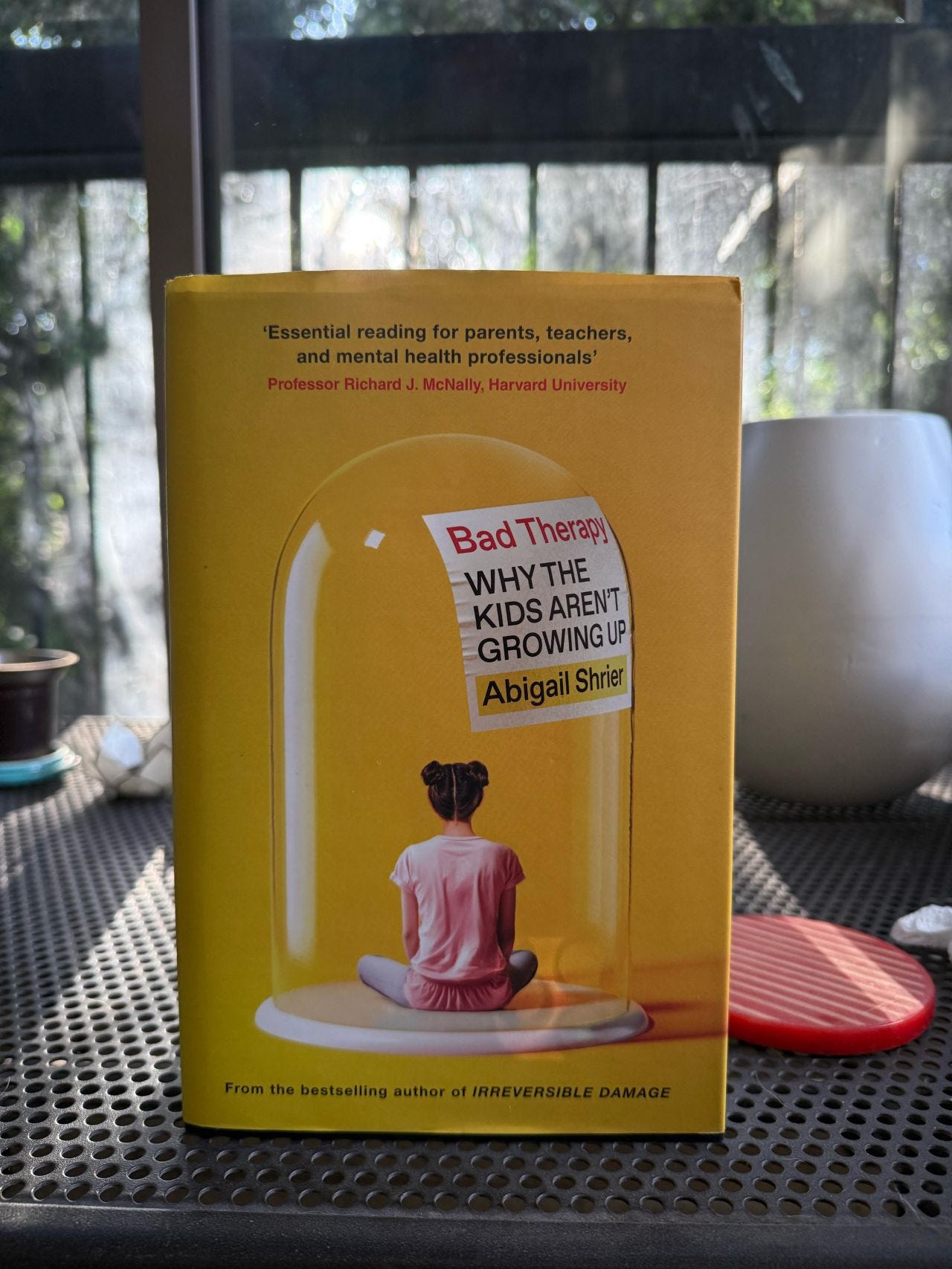 I read "Bad Therapy: Why The Kids Aren't Growing Up" by Abigail Shrier, which explores the negative effects of therapy on young people, mainly across the United States.