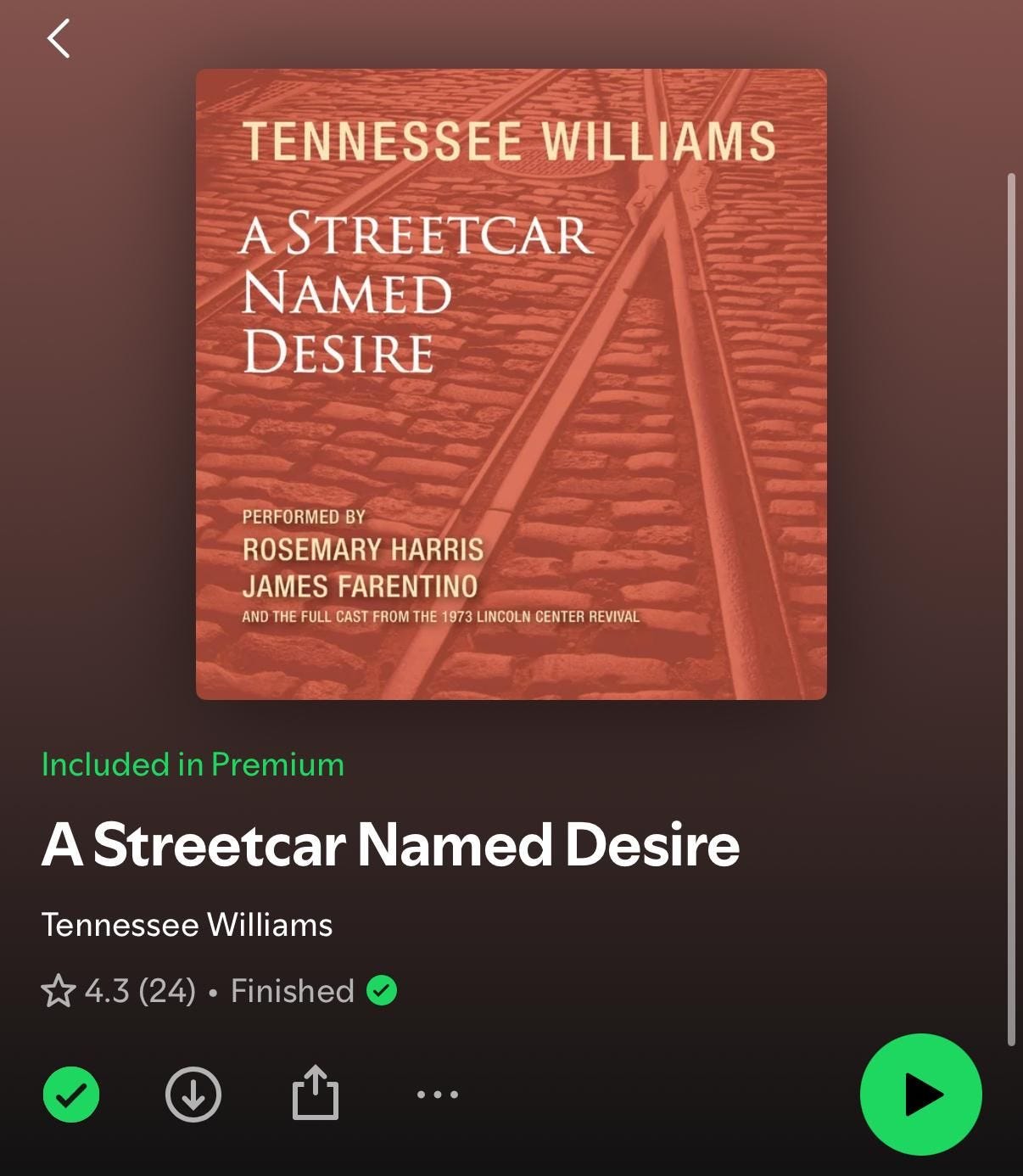On a car ride with friends, I listened to a performance of "A Streetcar Named Desire" by Tennessee Williams. Since it's a play, the whole thing took two hours - barely an afternoon.